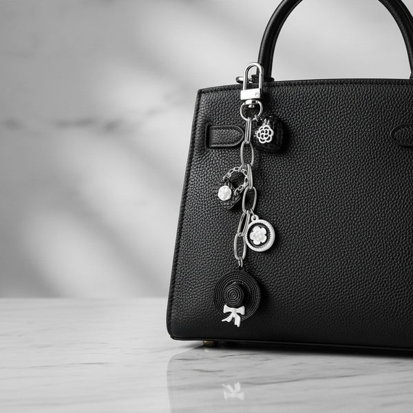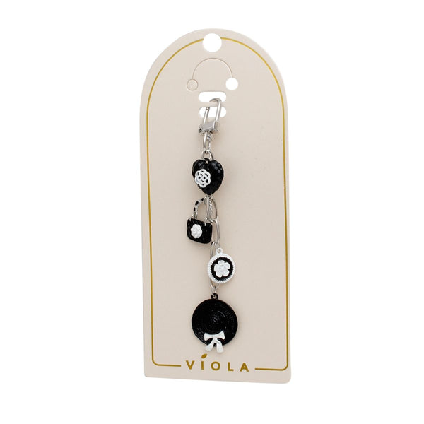 Women's Keychain Purse Clip Silver Metal Swivel Hook Clasp Keychain Purse Charm Clip Featuring Black and White Camellia Charms Including: Heart, Handbag, Flower, and Hat.