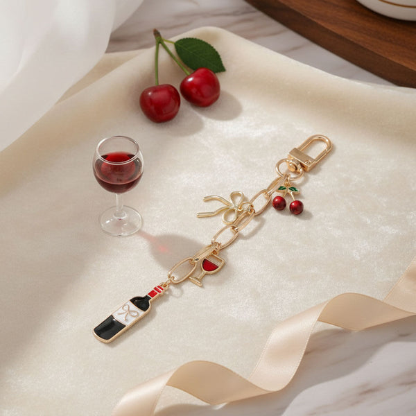 Women's Keychain Purse Clip. Gold Metal Swivel Hook Clasp Keychain Purse Charm Clip Featuring Wine Lovers Charms Including: Red Double Cherry, Bow, Wine Glass, and Bottle of Wine.