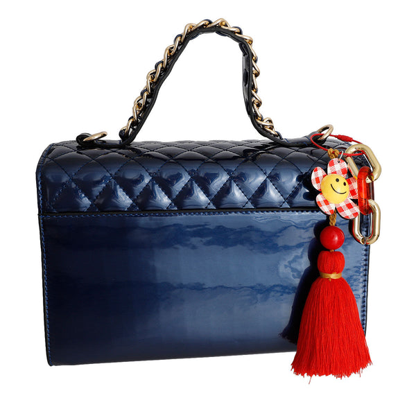 Llavero con forma de carita sonriente de acrílico a cuadros rojos y blancos y dije para bolso y anillo con borla roja con detalle de dije de eslabón de cadena de acrílico. Características del anillo Apertura y cierre de rosca. **Bolsa no incluida