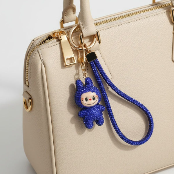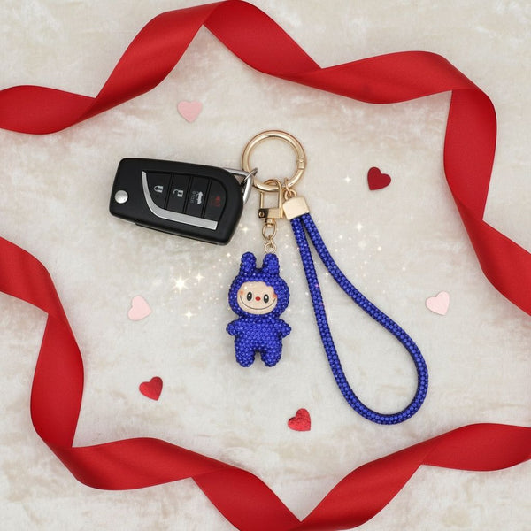 Women's Rhinestone Phone Wrist Strap Charm Keychain. Luxury Bling Phone Accessory. Sparkling Royal Blue Rhinestone Encrusted Tube Wristlet Phone Strap Featuring Round Gold Metal Push Clasp, Plastic Card for Inserting into Phone Case, and Cute Rhinestone Encrusted Labubu Doll Charm with It's Own Removable Push Clasp. Perfect for Hands-free Convenience. Charm Measures 2.25 inches x 1.35 inches. Loop Measures 10".