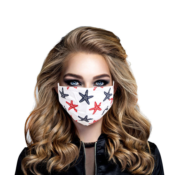 Mascarilla de tela blanca con estampado de estrellas de mar rojas y azules. Correas ajustables para las orejas. Bolsillo de filtro interior. *Filtro No Incluido. Alambre nasal ajustable. 100% algodón. Reutilizable. Lavable.