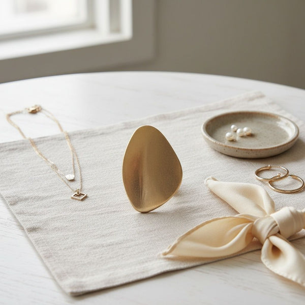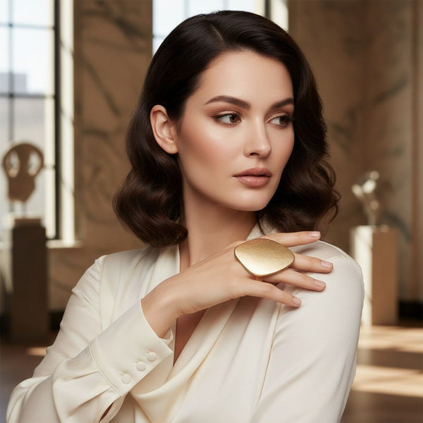 Women's Stretch Statement Ring. Industrial Luxe Matte Gold Metal Statement Ring Featuring XLarge Irregular Organic Oval Design with a Textured Stretch Band for Comfort Wear. Ring is Suited for Sizes 8+. Modern Sculptural Style. Ring Measures 2.75 inches x 1.8 inches.