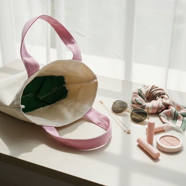 Alpha Kappa Alpha Sorority Merch Paraphernalia Mini Canvas Tote Bag. Sorority-core Personal Style Ready AKA Mini Reusable Canvas Tote Bag. Designed for Everyday Use, this Blank Durable Tote is Constructed of Cream Canvas Fabric with Color Contrast Green Canvas Bottom and Pink Straps. Eco-friendly Tote has Convenient Pockets on Both Sides. Blank, Customizable Carryall that's Perfect for Adding your Own Patches and Pins. Straps Measure 8" Tall.