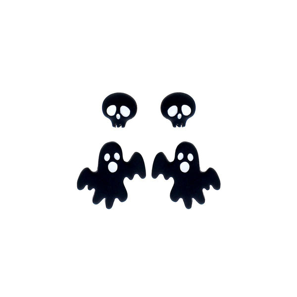 Juego de 2 pares de aretes de calavera y fantasma espeluznante con revestimiento negro.