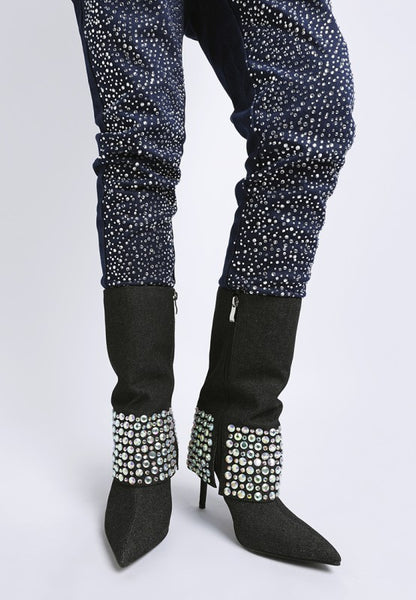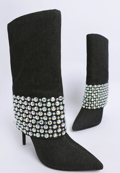 Soft to the touch and sharp in style, these boots bring together a smooth microfiber upper, fold over silhouette, and just enough rhinestone sparkle to stand out. The side zipper makes getting ready easy, and the stiletto heels add a fine lift.
