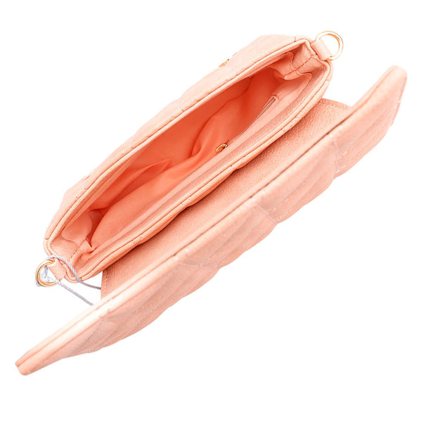 Bolso bandolera rectangular de piel vegana acolchada en color rubor con solapa y cierre a presión. Correa de hombro desmontable.