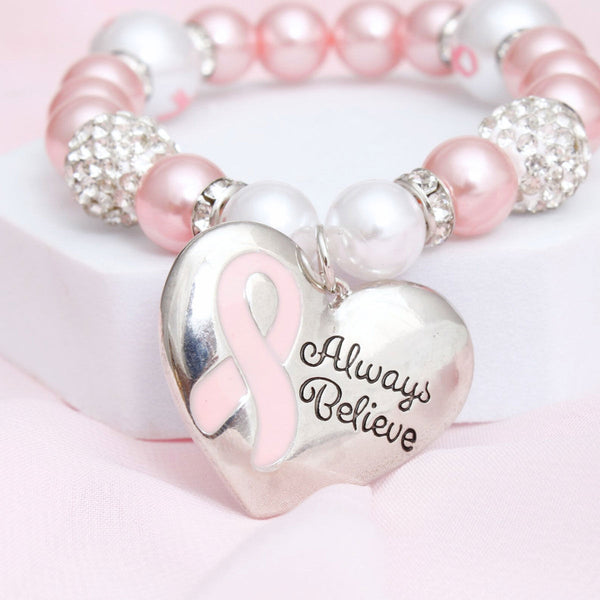 Women's Breast Cancer Pink Ribbon Stretch Bracelet. Acrylic Light Pink Pearl Stretch Bracelet Featuring Pink Ribbon Printed White Pearls, Clear Rhinestone Ball Beads, and Silver Metal Heart Charm Engraved with Always Believe and Light Pink Breast Cancer Ribbon. Heart Charm Measures 1" x 1.3".
