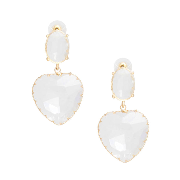 Women's Drop Earrings. Gold Metal Setting and Clear Glass Oval Crystal Earrings Featuring Drop Clear Glass Heart Crystal Detail. Post Backing.