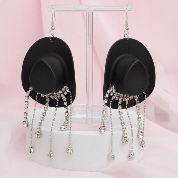 Women's Fish Hook Earrings. Long Silver Metal Fish Hook Earrings Featuring Acrylic Black Cowgirl Cowboy Hat with Silver Metal and Clear Rhinestone Fringe Drop Detail. Yeehaw!