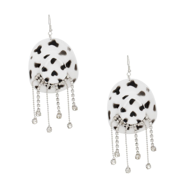 Women's Fish Hook Earrings. Long Silver Metal Fish Hook Earrings Featuring Acrylic White with Black Detail Cowgirl Cowboy Hat with Silver Metal and Clear Rhinestone Fringe Drop Detail. Yeehaw!