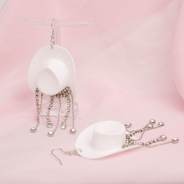 Women's Fish Hook Earrings. Long Silver Metal Fish Hook Earrings Featuring Acrylic White Cowgirl Cowboy Hat with Silver Metal and Clear Rhinestone Fringe Drop Detail. Yeehaw!