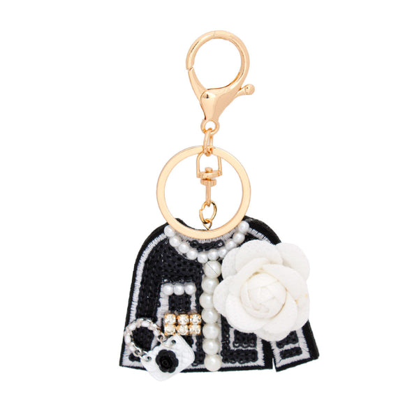 Women's Keychain Ring and Handbag Clip Featuring Gold Metal with Black Felt Fabric French Luxe Camellia Couture Sweater Shaped Charm Featuring White Flower, Sequins, Pearls, Rhinestones, and Handbag Detailing.