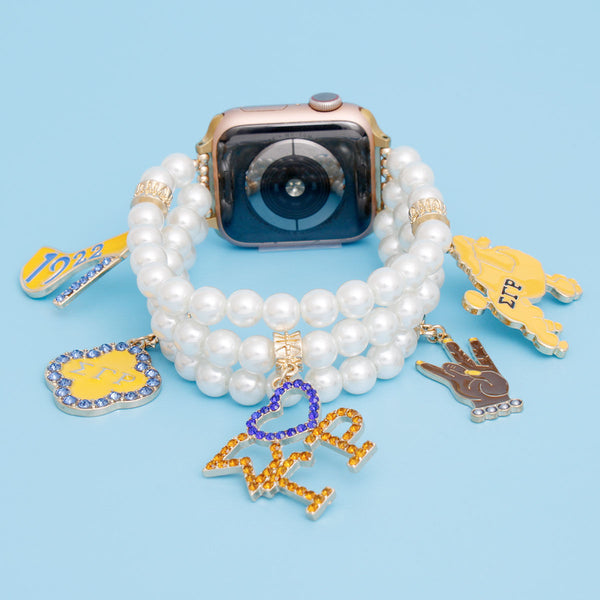 Sigma Gamma Rho Sorority Paraphernalia Women's Watch Band. Gold Metal with 3 Rows of Cream Acrylic Pearl Stretch Strands Featuring 5 Different Rhinestone Gold and Blue SGRHO Sorority Charms. Fits 38. 40. 41 mm. Easy Adjustable Sizing. Band measures 1" wide. Heart SGRHO Charm measures 1".