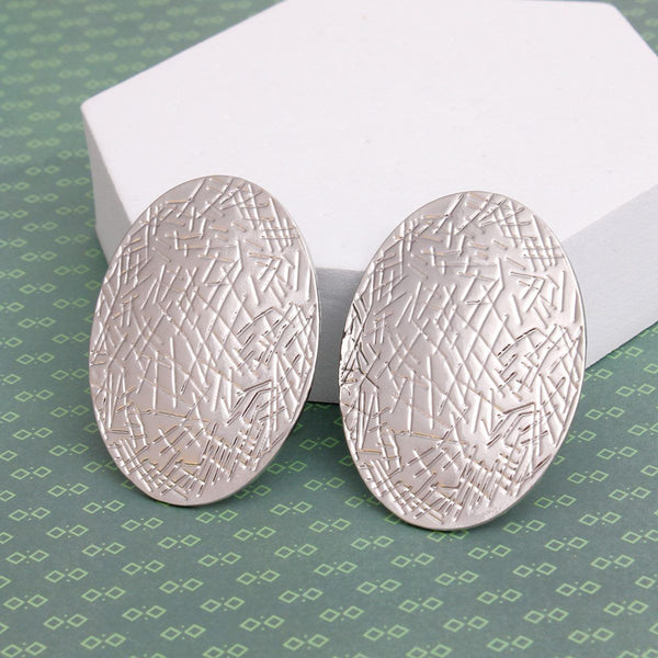 Stud Silver Metal Scratched Oval Plate Earrings