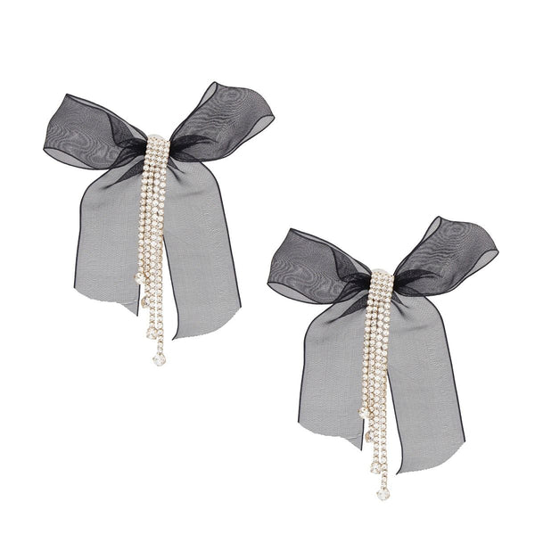 Tassel Black Ribbon Bow Sparkling Fringe Earrings