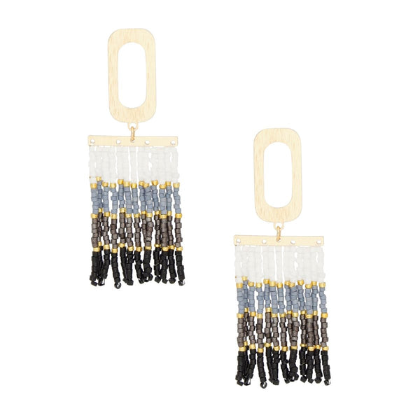 Women's Tassel Earrings. Gold Metal Cut Out Rectangle Post Earrings Featuring Drop Tassel Consisting of Layered Acrylic Seed Bead Colors Ranging from White, Gray, Dark Gray, and Black. Post Backing.