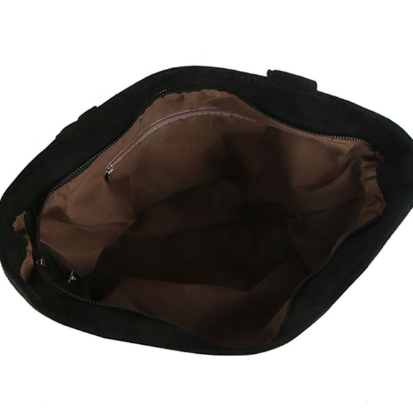 Women's Tote Handbag. Trending Classic Super Soft Yellow and Black Vegan Faux Suede Tote Bag Purse. Bag Features Yellow Front, Black Rear, with Black Handles, Bottom, and Top Detailing. Main Zipper Closure. Interior Has Side Zipper Pocket. 100% Polyester.