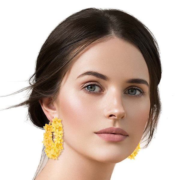 Aretes de aro de metal dorado cubiertos con detalles de flores de margaritas amarillas acrílicas.