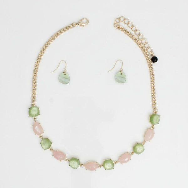 Alpha Kappa Alpha Sorority Paraphernalia Women's Chain Necklace Set. Elegant Gold Metal Curb Chain Neckline Necklace Featuring Collar Comprised of Alternating Round Marbled Green Resin Pieces and Marbled Pink Resin Teardrop Pieces. Necklace Measures .55 inches wide. Lobster Clasp Closure. Includes Matching Disc Drop Fish Hook Earrings.