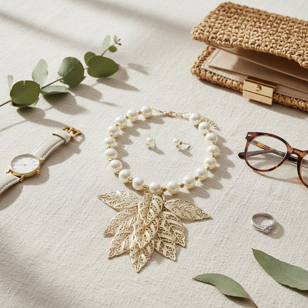 Vintage Drama, Simplified: Channel old Hollywood glamour with this stunning Cream pearl and gold bib set. The chunky necklace features a bib of high-shine polished gold acrylic layered filigree Leaf Drop Details. The necklace is finished with a secure metal Lobster Clasp Closure. Necklace Length 20 inches with 3 inch extender. Set includes Ball Pearl Stud Post Backing Earrings. Leaf Drop Measures 2.85 inches x 1.3 inches.