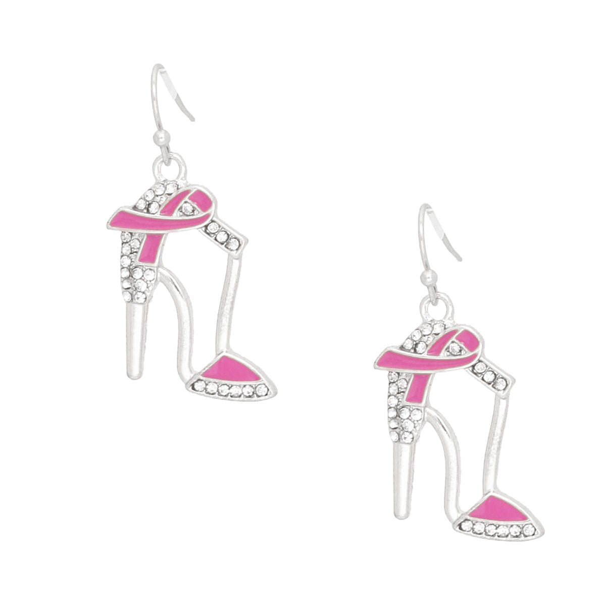 Women's Breast Cancer Pink Ribbon Fish Hook Earrings. Silver Metal Fish Hook Earrings with Silver Metal High Heel Shaped Drop Featuring Clear Pave Rhinestones and Fuchsia Pink Ribbon Detailing.