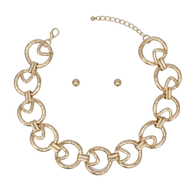 Women's Chain Necklace Set. Edgy Sculptural Chunky Gold Metal Round Link Chain Necklace Featuring Raised Geometric Triangle Overlay. Dimensional Chain. Each Link Measures 1.5". Lobster Clasp Closure. Includes Matching Ball Stud Post Backing Earrings.