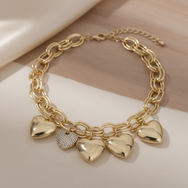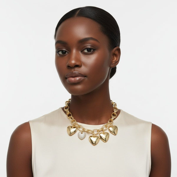 Women's Chain Necklace. Romantic and Flirty Double Oval Gold Acrylic Link Chain Necklace Featuring 4 Chunky Puffy Heart Charms and 1 Aurora Borealis Rhinestone Encrusted Heart Charm. Puffy Hearts Measure 1.25 inches and Rhinestone Heart Measures 1 inch. Gold Metal Lobster Clasp Closure.