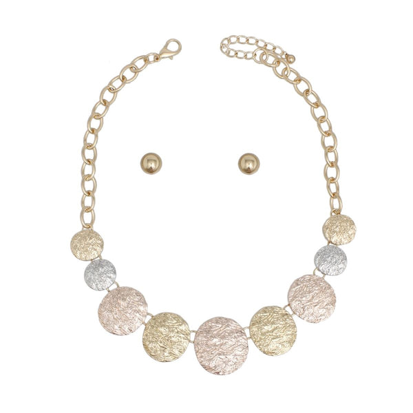 Women's Chain Link Necklace Set. Heavy Duty Grit-meets-glam Polished Gold Metal Oval Link Chain Necklace Featuring Front Detail Comprised of Graduated Thick Gold, Silver, and Rose Gold Mixed Metal Round Linked Discs Featuring Crinkled Metal Texture Detailing. Center Disc Measures 1.5" x 1.35". Lobster Clasp Closure. Includes Matching Domed Post Backing Stud Earrings.