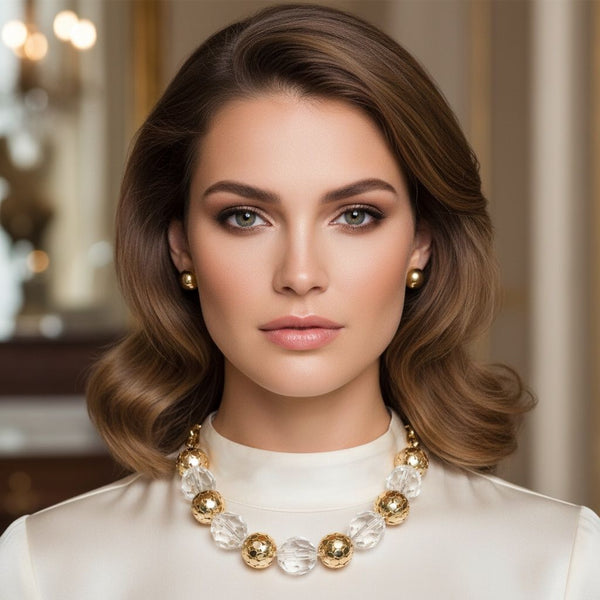 Women's Beaded Necklace Set. Make a Bold Statement with this Chunky Mixed Bead Necklace Featuring Oversized Clear Acrylic Faceted Beads and Hollow Metal Ball Beads. Designed for High-Impact Style, This Dimensional Piece Blends Industrial Shine with Glossy Depth for a Modern Glam Look. Gold Chain Neckline. Faceted Beads Measure 1 inch Each. Gold Metal Lobster Clasp Closure. Includes Ball Stud Post Backing Earrings.