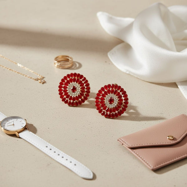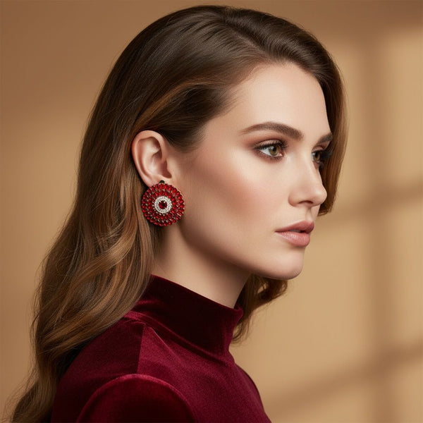 Women's Clip On Earrings. Light Catching Brilliance Radiant Round Clip On Earrings Featuring Two Rows of Red Glass Teardrop Crystals Surrounding a Clear Rhinestone and Red Oval Crystal Center Set in Gold Metal. Date-Night Sparkle and Shine. Paddle Back Closure.