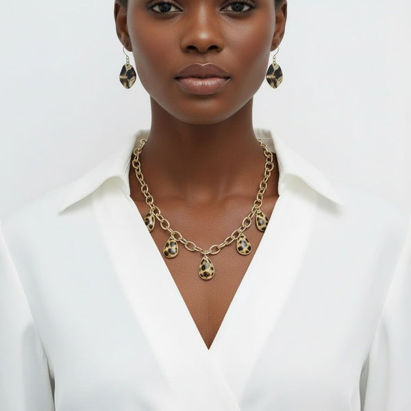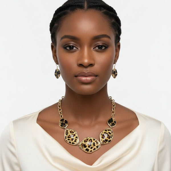 Women's Collar Necklace Set. Bold Tribal Inspired Statement Necklace Featuring A Gold Metal Oval Link Chain Neckline With A Sculptural Collar Design. The Collar Showcases Organically Shaped Linked Pieces Detailed With Dimensional Raised Leopard Print Resin Paired With Smooth Surface Leopard Print Resin Accents For Rich Texture And Contrast. The Center Collar Piece Measures Approximately 2.5 Inches By 1.85 Inches, While The Full Leopard Print Section Spans Approximately 10 Inches Across. Finished With A Secure Lobster Clasp Closure. Set Includes Coordinating Fish Hook Drop Earrings For A Complete, Head Turning Look.