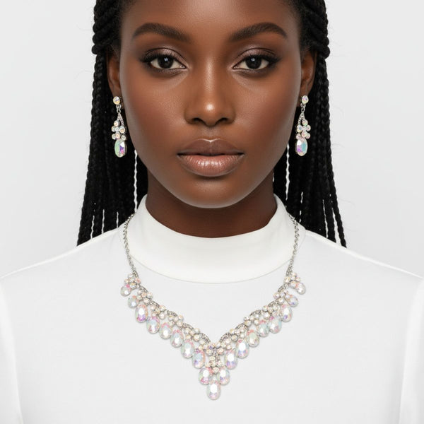 Women's Formal Collar Necklace Set. Silver Metal with Glittering Oval Aurora Borealis Crystals Pointed Collar Necklace Featuring Light Catching Brilliant Round Rhinestone Cluster Detailing and Graduated Design. Collar Center Point Measures 2 inches Long. Silver Metal Chain Neckline and Lobster Clasp Closure. Includes Matching Crystal Rhinestone Drop Post Backing Earrings. 1.75 inches x .55 inches.