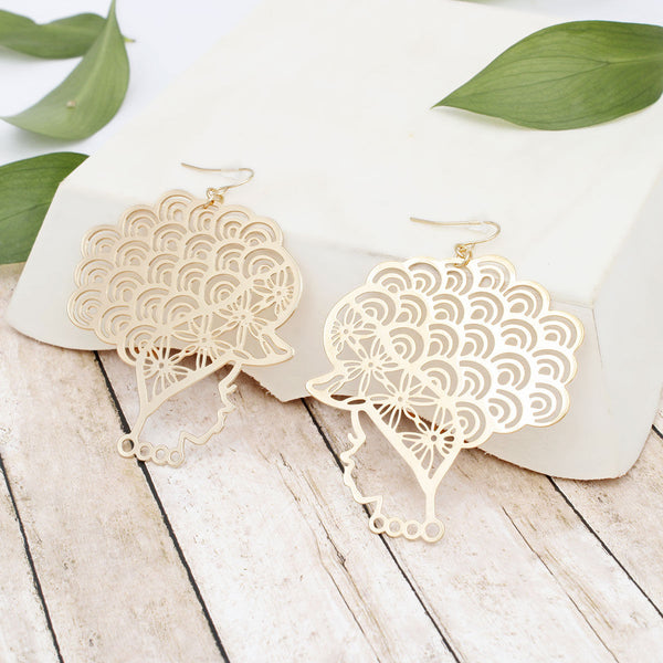Women's Fish Hook Earrings Gold Metal Intricate Cut Filigree Fish Hook Earrings Featuring Curly Haired Women's Side Profile with Bandana and Necklace Detailing.