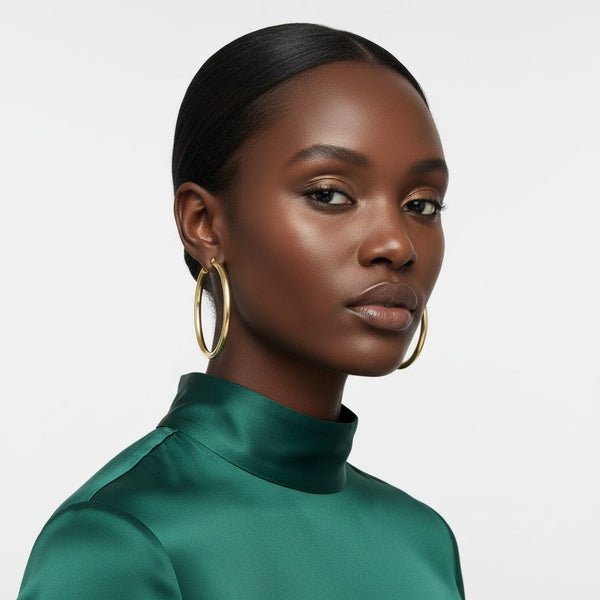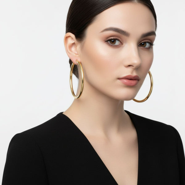 Women's Stainless Steel Hoop Earrings. Premium 70mm Stainless Steel Hoop Earrings Featuring 18k Gold IP Plating and Hollow 5mm Thick Wide Hoop Design. Gold IP Plating is More Durable and Resistant to Wear and Tarnish than Traditional Gold Plating Methods, Making it Ideal for Items that are Worn Daily. Hypoallergenic, Corrosion-Resistant, and Safe for Sensitive Skin. Daily-wear Essential Style. Lever Back Closure.
