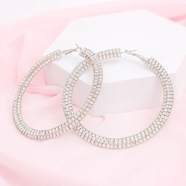Women's Hoop Earrings. Iced Silver Metal and Clear Pave Rhinestone 3 Line 80mm Hoop Earrings Featuring Stacked Row Design. Saddleback Closure.