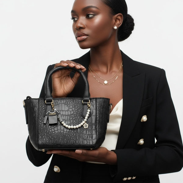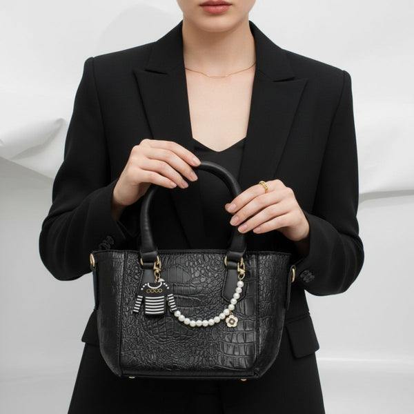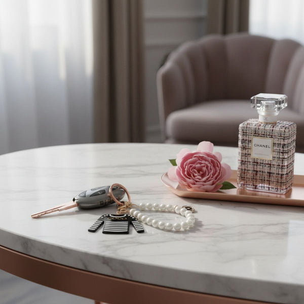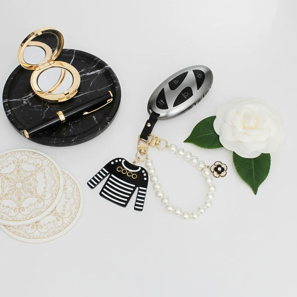 Women's Keychain and Bag Clip. Luxe French Designer White Acrylic Pearl Bag Clip Keychain with Shirt Shaped Black Acrylic and White Stripes Charm Featuring COCO Detail and Black Rhinestone Camellia Flower Charm. Burnished Gold Metal Swivel Hook Closure.