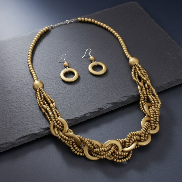 Women's Long Beaded Necklace Set. Vibrant Long Beaded Necklace Featuring Six Strands of Small Gold Wooden Beads Intricately Woven Through Wooden Disc Rings. Bold Artisanal Design. Necklace Measures 1.45 inches wide. Silver Metal Lobster Clasp Closure. Includes Matching Wood Ring Drop Fish Hook Earrings Measuring 2.75 inches x 1.35 inches.