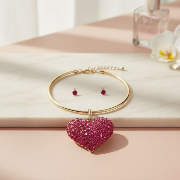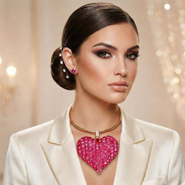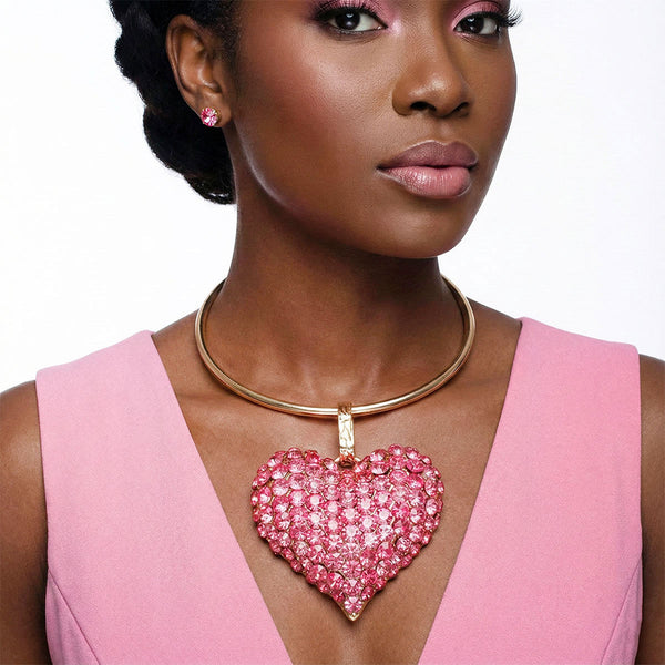 Women's Pendant Necklace Set. Fun and Flirty Gold Metal Rigid Collar Necklace Set Featuring Ultra Chunky XL Domed Heart Pendant with Fuchsia Rhinestone Detailing. Heart Pendant Measures 4 inches x 3.25 inches. Lobster Clasp Closure. Includes Matching Rhinestone Stud Post Backing Earrings.