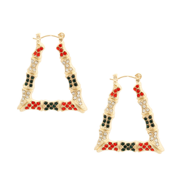 Gold Metal with Red and Green Rhinestone Trapezoid Shaped Bamboo Hoop Earrings. Earrings measure 1.45 inches wide.