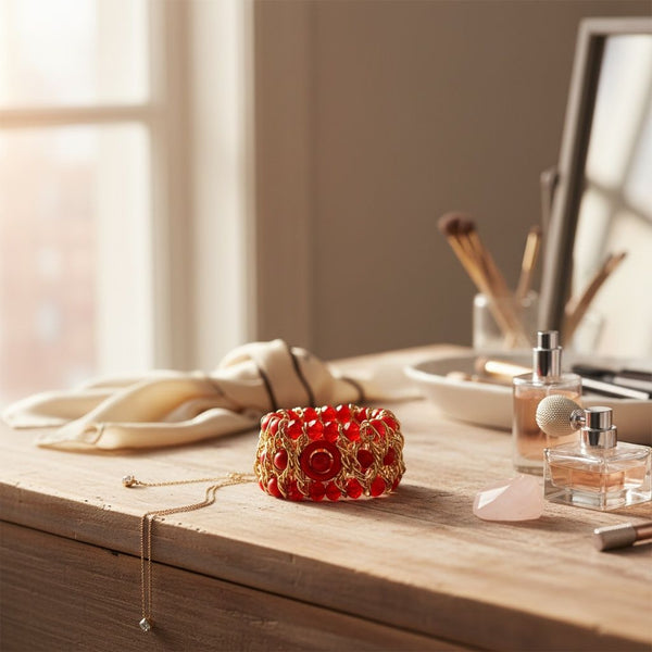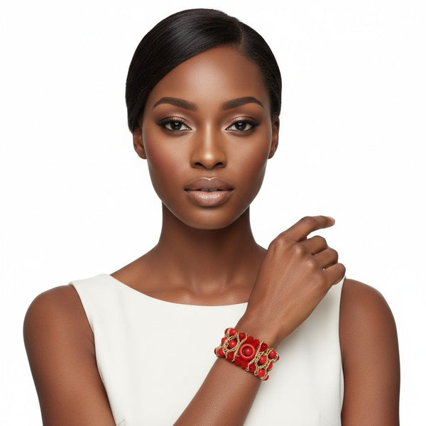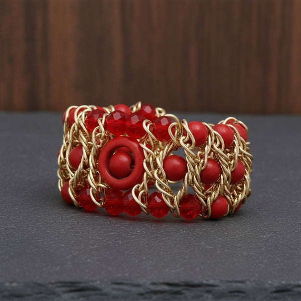 Women's Beaded Bracelet. Stunning Red Stretch Bracelet Featuring 3 Rows of Red Glass Beads and Red Acrylic Cracked Detail Beads Woven Intricately with Gold Wire Including Ring and Ball Bead Details. Upgraded Tribal Style. Bracelet Measures 1.5" Wide.