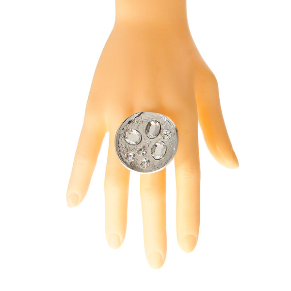 Silver Textured Metal Adjustable Ring Featuring Clear Crystal Rhinestone Detailing. Detail measures 1.5 inches