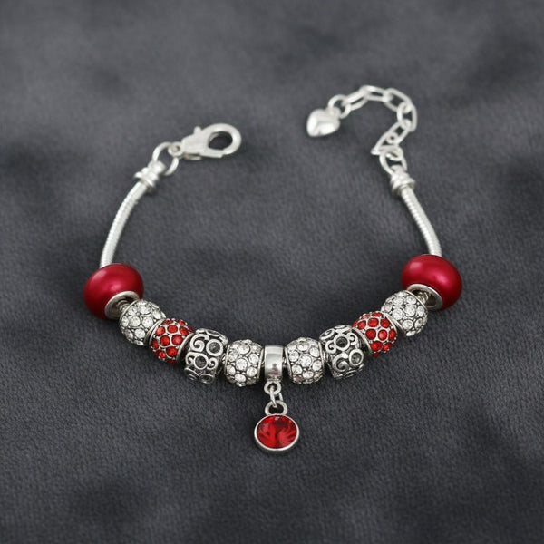 Delta Sigma Theta Sorority Paraphernalia Women's Charm Bracelet. European Style Silver Metal Snake Chain Bracelet Featuring Assorted Luxe Red and Clear Rhinestone Slide Charms, Engraved Burnished Silver Metal Slide Charms, Acrylic Pearl Red Slide Charms, and Red Rhinestone Dangle Charm. Lobster Clasp Closure with Heart Charm Extension Chain.