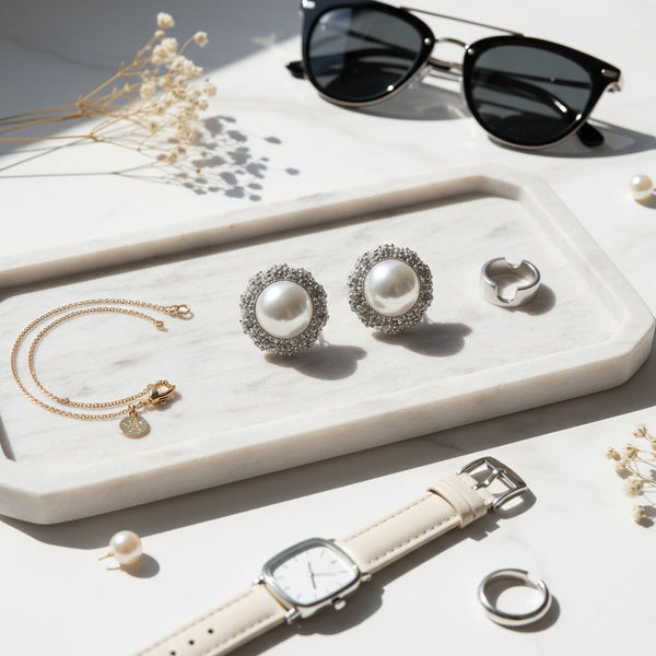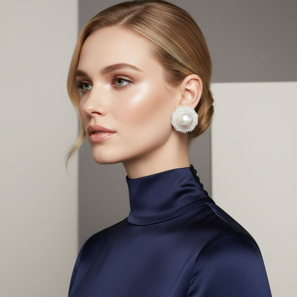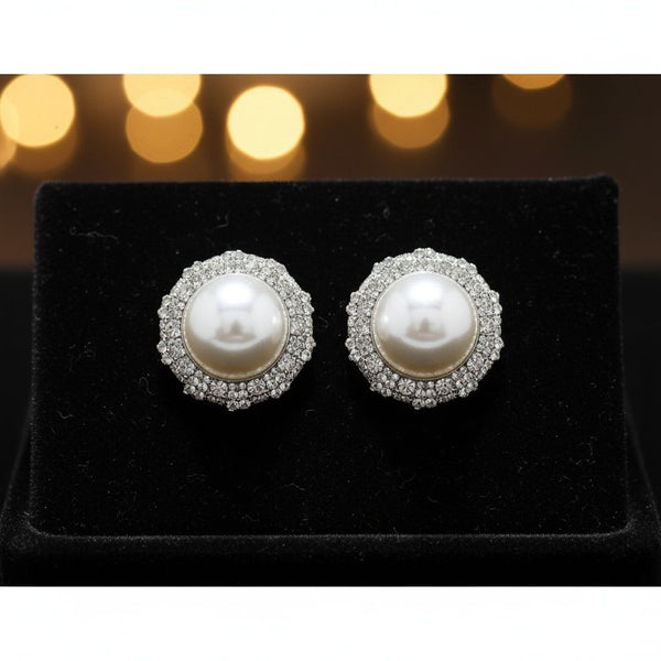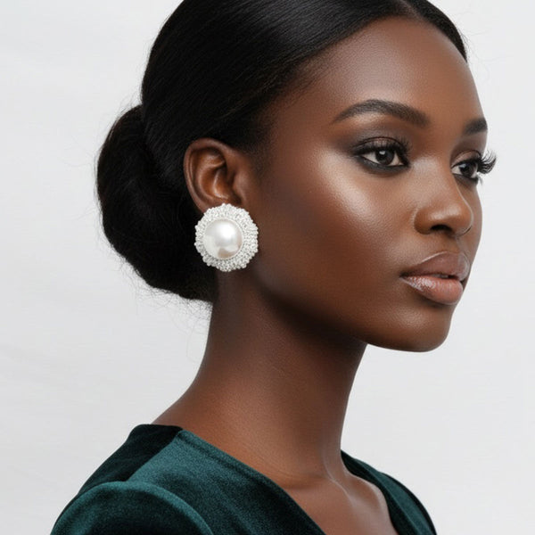 Women's Stud Earrings. Elegant and Classy Sparkle Statement Earrings. Silver Metal Wreath Shaped Stud Earrings Encrusted with White Pearls and Rhinestones Featuring Oversized Acrylic White Pearl Domed Center. Dome Measures .75 inches tall. Post Backing.