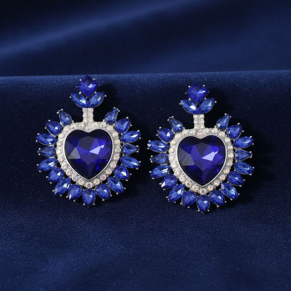Women's Stud Earrings. Light Catching Brilliance Bold Stud Earrings Featuring a Large Faceted Dark Royal Blue Glass Heart Framed by a Radiant Royal Blue Crystal Fanned Outline and Aurora Borealis Rhinestone Details Set in Silver Metal. Romantic Sparkle with Playful Glamorous Edge. Post Backing. Heavy Stud Earrings.