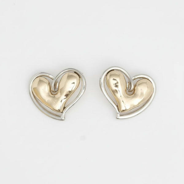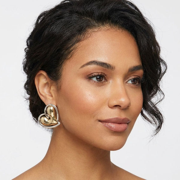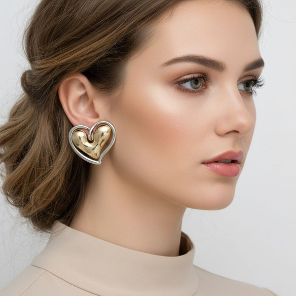 Women's Stud Earrings. Modern Romantic Two Tone Chubby Heart Shaped Stud Earrings Featuring Gold Metal Domed Heart with Silver Metal Outline. Post Backing.