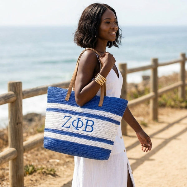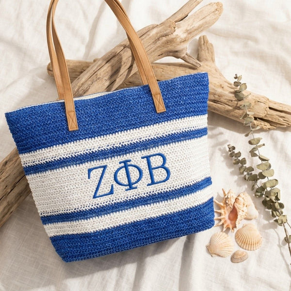 Zeta Phi Beta Sorority Paraphernalia Women's Beach Tote Bag. Show your Sisterhood Pride on the Beach or Pool with This Woven Faded Blue and White Stripe Raffia Large Beach Tote Bag Featuring Embroidered ZPB Greek Letter Detailing. Rafia Detail is Woven Over Canvas for a Sturdy Bag. Polyester Fabric Lined Interior with Small Side Pocket and Main Zipper Closure. Brown Faux Leather Shoulder Straps Measuring 11.5 inches Tall. Embroidery Measures 2.4 x 7 inches.